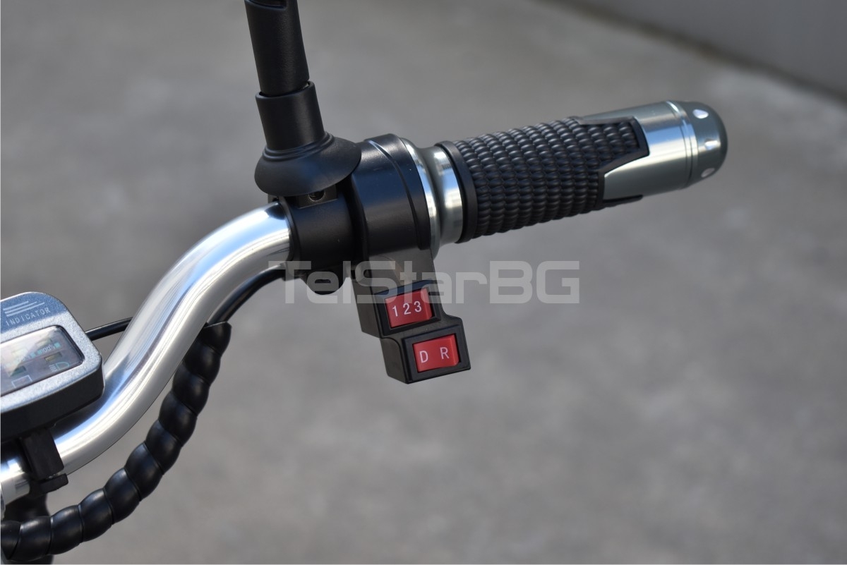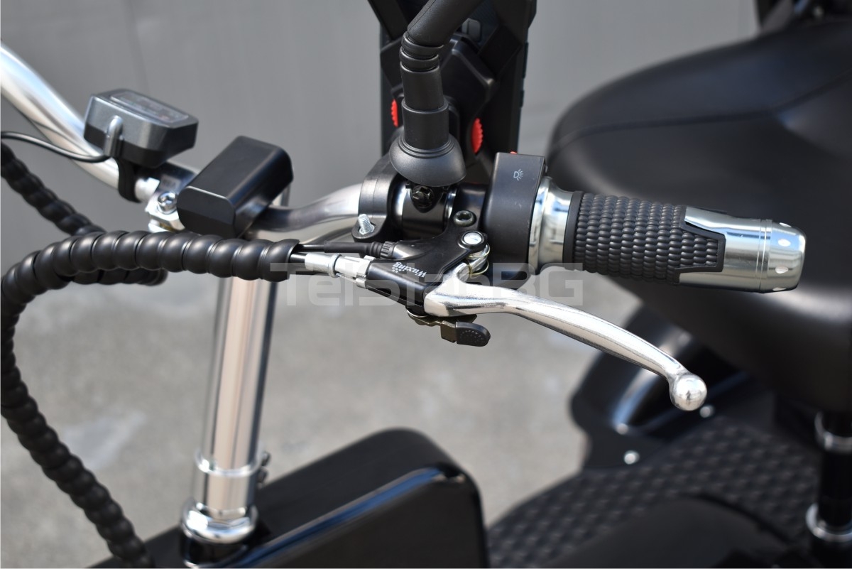 Допълнителна информацияпреден шоков амортисьор предна светлина с фар тип РИБЕШКО ОКО, 120 градуса ъгъл на разпръскване на светлината индикатор за мощността паркинг бутон клаксон мека и удобна кожена седалка със защита против претоварване и презареждане задни хидравлични спирачки налични цветове: металик червен, металик син, черен лак Само сега при закупуване получавате напълно безплатно следните екстри и аксесоари: USB порт на кормилото за зареждане на мобилни устройства широк и удобен държач за мобилни устройства за кормилото с настройка на размерите голяма задна кошница за багаж огледала за задно виждане